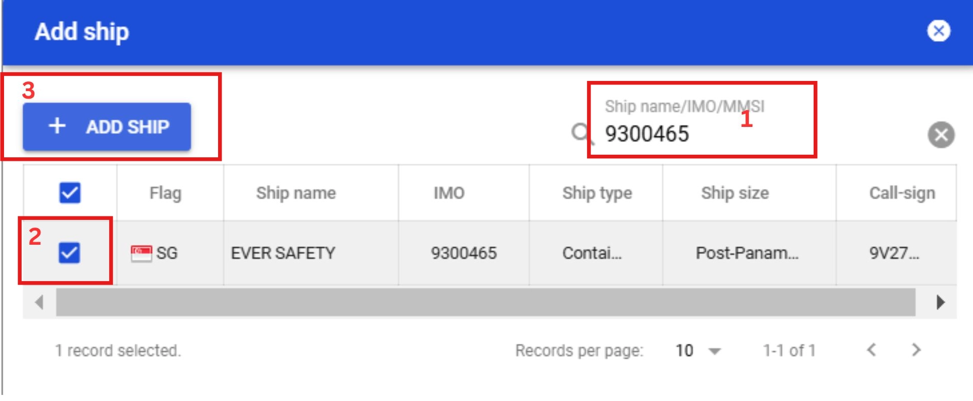 Once the add ship pop-up appears, input either the ship name, IMO or MMSI on the search bar. Tick the ship you would like to add and then click the ‘Add Ship’ button.