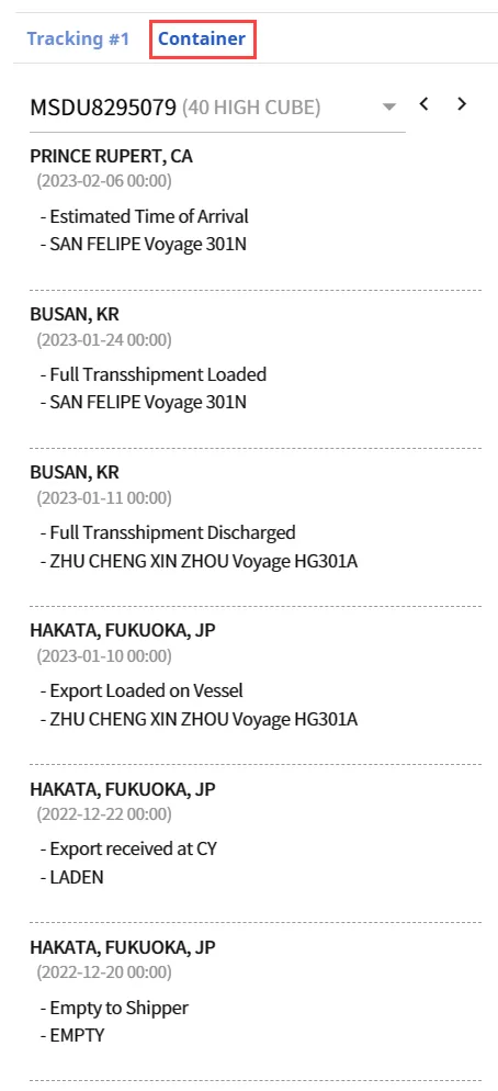 B/L 뿐만 아니라, 컨테이너 기준으로 컨테이너의 모든 이벤트를 확인할 수 있습니다.